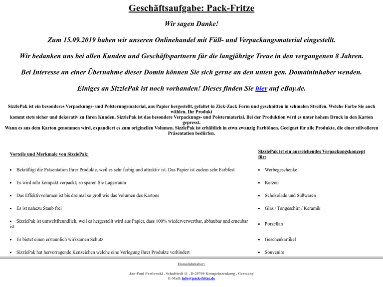 Pack-Fritze. de ist am 15. August 2011 als Vertriebs- und Handelspartner von Füll- und Verpackungsmaterial im Internet gestartet. Das Gewerbe wird auf. . .